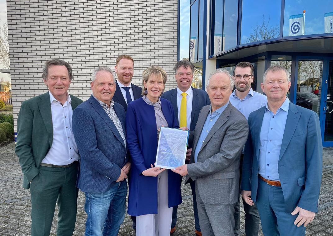 V.l.n.r.. Gerard Nijland (wethouder gemeente Montferland), Hans van der Noordt (wethouder gemeente Berkelland), Robbert Hummelink (wethouder gemeente Doetinchem), Helga Witjes (gedeputeerde Provincie Gelderland), Gosse Visser (wethouder Winterswijk), John Haverdil (wethouder Oude IJsselstreek), Luke Gilbers (directeur eigenaar Waterkracht), Antoon Peppelman (wethouder gemeente Bronckhorst).